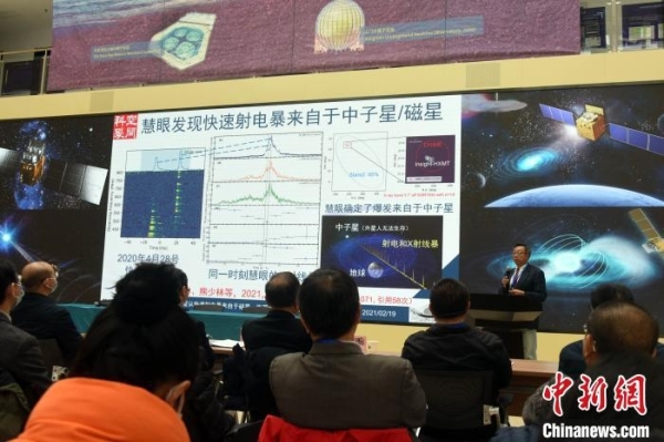 中國科學院高能物理研究所(中科院高能所)2月19日在北京舉行“‘慧眼’天文衛星(HXMT)證認快速射電暴來自于磁星”新聞發布會說,針對2020年4月發現的編號為FRB 200428的亮度極高的快速射電暴,中國“慧眼”衛星最新觀測發現首個跟該神秘快速射電暴相關聯的X射線暴,確認其來自銀河系內編號SGR J1935+2154的磁星,并在國際上首先證認該X射線暴包含的兩個X射線脈沖是快速射電暴的高能對應體。