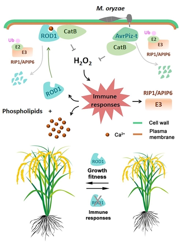 據(jù)何祖華研究員介紹,這一研究最新發(fā)現(xiàn)水稻的“鈣離子感應(yīng)子ROD1”,是一個新的植物免疫抑制中樞。當(dāng)沒有病原菌侵染時,ROD1可將水稻的基礎(chǔ)免疫維持在較低水平,以有利于水稻生長,提高產(chǎn)量。但當(dāng)遭遇病原菌侵染時,水稻就進化出免疫激發(fā)新途徑:通過降解ROD1,減弱其功能,從而保證植物在抵御病原菌時,產(chǎn)生有效的防衛(wèi)反應(yīng),不至于迅速發(fā)病枯死,并能繁殖后代。
