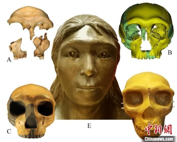 華龍洞6號頭骨面貌復原(A華龍洞6號化石;B虛擬復原頭骨;C實體復原頭骨;D雕塑頭骨;E復原像)。中科院古脊椎所供圖