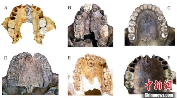 華龍洞6號(A)與部分古人類化石硬腭部門齒孔位置(B非洲;C周口店; D摩洛哥;E金牛山;F山頂洞) 中科院古脊椎所供圖