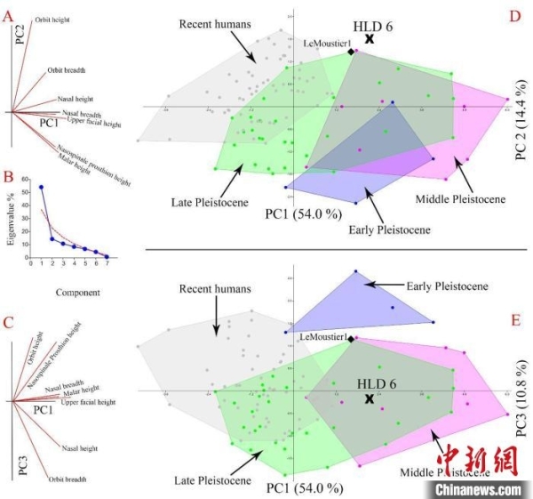 華龍洞6號與世界范圍更新世古人類及現代人類面部測量數據多變量統計分析。中科院古脊椎所供圖