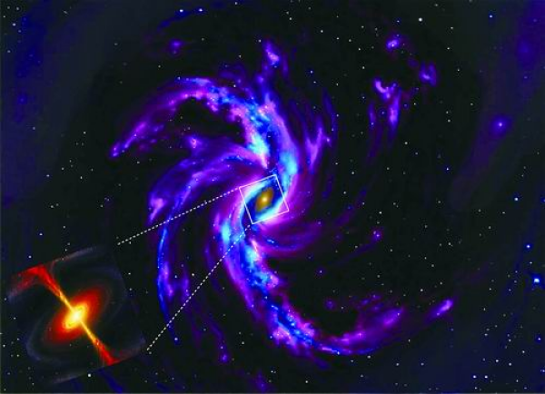 具體而言,在該大質(zhì)量恒星形成區(qū)中約2萬(wàn)天文單位尺度上,數(shù)條清晰的氣體流將外圍物質(zhì)向核心輸運(yùn),形成“旋臂”。這些“旋臂”狀氣體流連接至一個(gè)約7500天文單位長(zhǎng)的棒狀結(jié)構(gòu),將氣體引導(dǎo)至核心區(qū)域。而在約2000天文單位的核心范圍內(nèi),氣體形成了旋轉(zhuǎn)塌縮包層,并在約500天文單位范圍內(nèi)形成了具有開普勒旋轉(zhuǎn)運(yùn)動(dòng)特征的吸積盤。值得一提的是,這是首次在單個(gè)大質(zhì)量氣體團(tuán)塊中,同時(shí)揭示多個(gè)環(huán)節(jié)相互連接的完整層級(jí)氣體系統(tǒng),該系統(tǒng)與棒旋星系具有驚人的相似性。