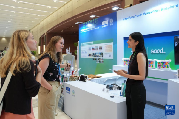 9月22日,代表在第五屆世界生物圈保護區大會的展區交流。新華社記者 黃宗治 攝