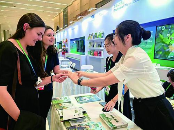 國際參會者在鼎湖山世界生物圈保護區的展臺前了解“中國經驗”。倪思潔/攝