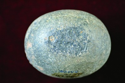 在這些石器之中,有一件顯得與眾不同——它通體圓潤,只在一側(cè)稍顯平坦,且有著些許淺淺的坑疤。