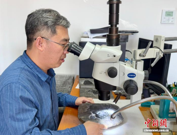 徐光輝研究員通過顯微鏡觀察安妮懷特魚化石正型標本。中新網記者 孫自法 攝
