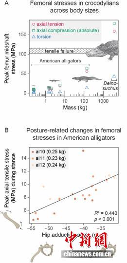 鱷類股骨應(yīng)力在不同(A)體型和(B)肢體姿勢下的變化(短吻鱷和恐鱷插圖由Takashi?Oda繪制)。中國科學(xué)院古脊椎所 供圖