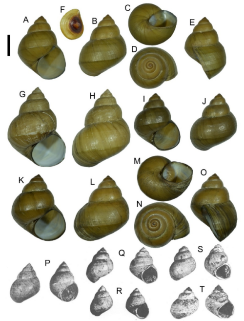 李四光婭田螺的現(xiàn)生個(gè)體貝殼(A—O)以及發(fā)現(xiàn)于第四紀(jì)沉積層的貝殼模式標(biāo)本(P—T)。(中國(guó)科學(xué)院昆明動(dòng)物研究所東南亞野生動(dòng)物多樣性課題組供圖)