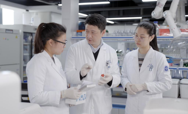 研究員胡海(左二)與團(tuán)隊(duì)成員交流。(中國(guó)科學(xué)院杭州醫(yī)學(xué)研究所供圖)