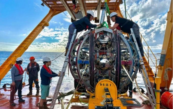 工程師準(zhǔn)備將1個(gè)探測(cè)器添加到海底KM3NeT網(wǎng)絡(luò)中。圖片來(lái)源:Paschal?Coyle?CNRS