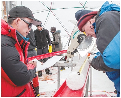 為確保冰芯不融化,鉆取冰芯的工作通常是在夜間完成的,夏季晚上8時(shí)到第二天早上8時(shí)是最佳時(shí)機(jī)。“最佳”意味著溫度低,科考隊(duì)員們會(huì)用呼氣來(lái)判斷開(kāi)工時(shí)間:能呼出“白氣”,溫度就低于零攝氏度了。夜間低溫狀態(tài)下工作,隊(duì)員們需要身著3公斤的厚重工作服作業(yè),每一個(gè)動(dòng)作都像在抵抗凝固的冷空氣,連最簡(jiǎn)單的器械操作、穿脫手套都遲緩而費(fèi)力。