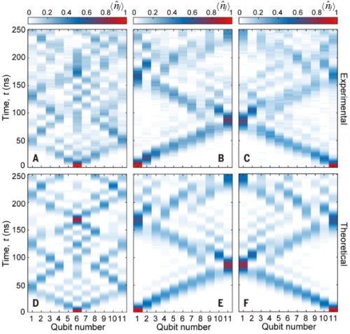 中國科學院院士、中國科學技術大學教授潘建偉團隊基于此前實現的12個量子比特多體真糾纏態,聯合中科院物理研究所理論團隊,首次在固態量子計算系統中實驗演示了強關聯糾纏體系的量子隨機行走。團隊研究了單粒子及雙粒子激發下一維短程耦合的量子隨機行走,觀察到了高保真度的態、糾纏度及關聯函數在時空光錐中的含時演化。此外,實驗上首次觀察到了由于邊界反射及波函數干涉形成的次級糾纏波陣面的傳播行為。在引入雙粒子激發的情況下,實驗上觀測到了由時間依賴的長程反相關的強關聯光子形成的費米子化行為,描繪出光子的反聚束行為。