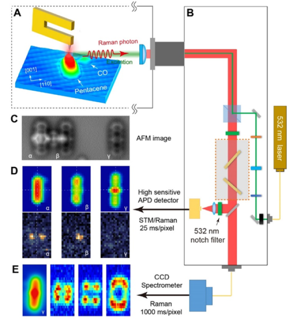 基于掃描探針的單分子多參量測量示意圖: (A)探針,(B)拉曼光譜光路,(C)AFM像,(D)STM像和利用高靈敏單光子計數器同步采集的C-H振動拉曼光譜像,(E)分子骨架結構的拉曼光譜像