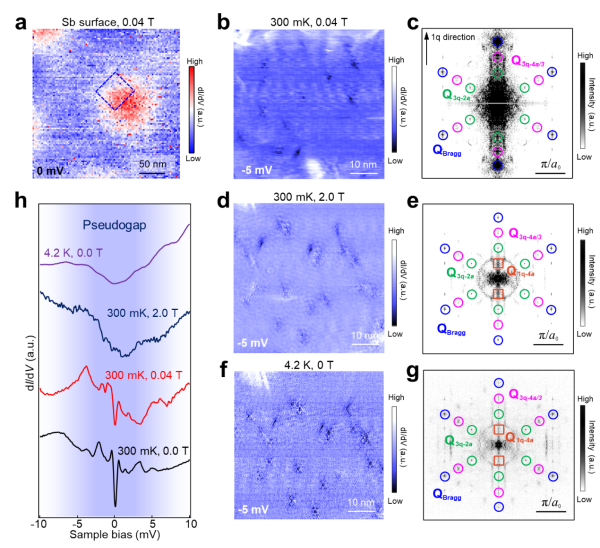 300 mK施加垂直磁場以及4.2 K零磁場下觀測到的配對密度波以及贗能隙