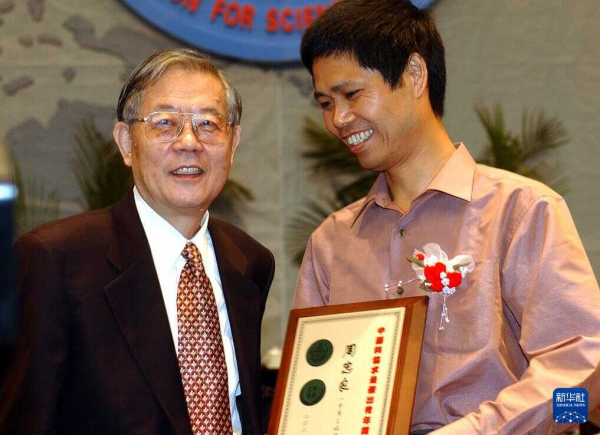 2003年9月13日,在中國科學技術協會2003年學術年會開幕式上,周光召同志為周忠良(右)等15人頒發中國科協“求是杰出青年獎”。新華社記者 郭大岳 攝