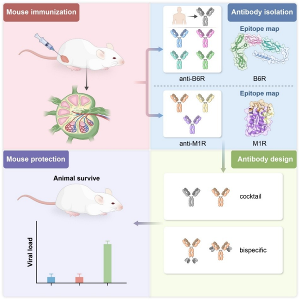 近日,中國科學院微生物研究所高福/王奇慧研究團隊,聯(lián)合中國醫(yī)學科學院薛婧研究團隊,解析了猴痘病毒關鍵免疫原M1R與B6R所誘導抗體的分子特征,并在此基礎上設計出雙特異性抗體。動物模型實驗顯示,該抗體表現(xiàn)出顯著的保護效果,為治療猴痘及其他正痘病毒感染提供了新的候選策略。