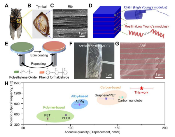 科研團隊解析蟬發聲器官——蟬肋骨膜的結構與性能關系,并據此仿生制備出可用于聲學換能器的高性能仿生薄膜。團隊發現,蟬肋骨膜中軟彈性蛋白層與硬幾丁質層交替排列的結構,是其優異力學性能的關鍵,即硬質層承擔機械負荷,軟質層通過大變形能力延緩裂紋擴展。基于這一機理,團隊采用層層交替旋涂限域構筑與界面交聯策略,制備出具有仿生軟硬交替結構的全有機復合薄膜。在限域條件下,聚合物分子鏈之間的纏結作用增強,使該仿生薄膜同時具備高拉伸強度、韌性和耐疲勞性能。這些特性使其能夠兼顧高效聲能輸出與長期穩定的聲傳播性能,其基本共振頻率和振幅均優于現有商業化薄膜。