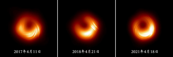研究發現,2017年至2021年,偏振方向發生翻轉。2017年磁場呈一方向螺旋,2018年相對穩定,而2021年完全反轉。研究認為,這種偏振旋轉方向的明顯變化,或源于內部磁結構與外部效應的共同作用。偏振的演化反映出黑洞周圍的湍動不止的環境,而其中磁場在物質如何落入黑洞以及如何向外釋放能量方面發揮著關鍵作用。