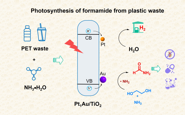 近期,中國科學院理化技術研究所研究員陳勇團隊,提出以廢棄PET和氨分別作為碳源和氮源,通過光催化C-N偶聯反應制備甲酰胺。研究人員設計了Pt1Au/TiO2光催化劑,其中單原子Pt位點能夠選擇性捕獲光生電子,Au納米顆粒能夠捕獲光生空穴,提升光生電子-空穴對的分離與轉移效率,增強光催化活性,使甲酰胺生成速率達~7.1 mmol gcat-1 h-1。原位紅外和電子順磁共振等實驗揭示了自由基介導的反應路徑,光生空穴同時氧化乙二醇和氨,生成醛類中間體與氨基自由基,二者發生C-N偶聯,最終生成甲酰胺。
