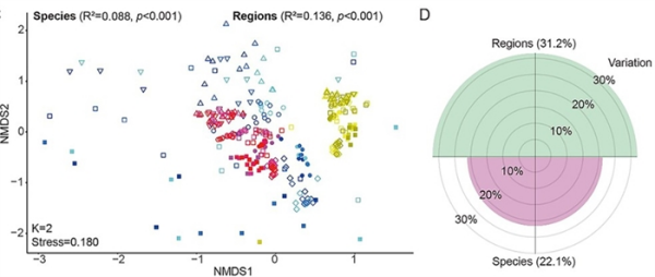 不同胃腸道區域和反芻動物物種的病毒多樣性及解釋貢獻度占比?