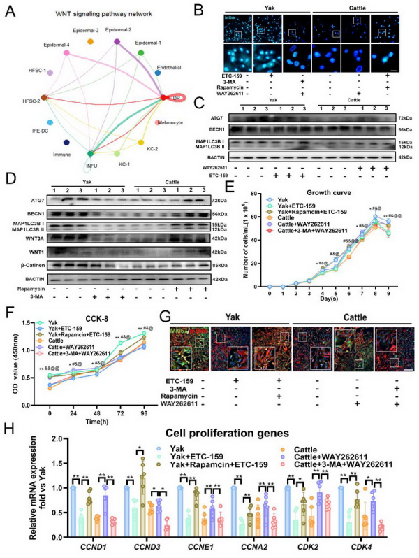 功能實驗表明,自噬抑制劑3-MA處理后的牦牛DP細胞生長曲線和細胞活力顯著下降,增殖標志物MKi67和PCNA的陽性率分別降低18.1%和22.6%。經自噬激活劑雷帕霉素處理后,普通牛DP細胞的增殖能力提升。WNT/β-Catenin通路在牦牛DP細胞中被抑制后會削弱細胞增殖能力,而在普通牛DP細胞中被激活后會提高細胞增殖能力。