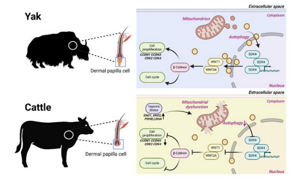 研究團隊進一步發現,轉錄因子SOX4可直接結合WNT1與WNT3A基因的啟動子區域,且這一結合對基因的轉錄激活作用通過雙熒光素酶實驗得到驗證。SOX4的表達受自噬水平調控,激活自噬可挽救SOX4抑制劑對DP細胞增殖的抑制作用。該調控通路在牦牛體中表現出更強的信號活性,通過促進DP細胞周期進程、增強細胞增殖能力來維持毛囊穩態。同時,該通路還能改善線粒體結構完整性以抵御氧化應激,從而可能促進毛囊生長,系統性增強牦牛對高原寒冷環境的生存適應能力。