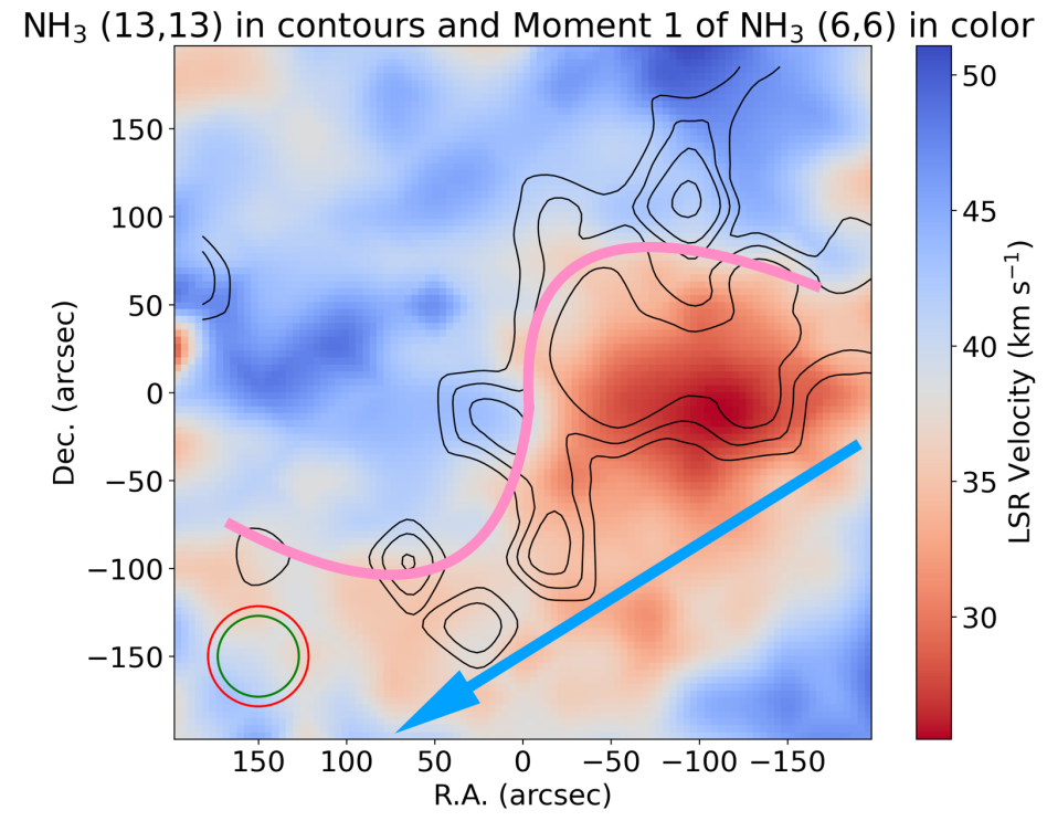 研究團隊利用天馬望遠(yuǎn)鏡(上海65米射電望遠(yuǎn)鏡)和西班牙耶韋斯40米望遠(yuǎn)鏡,對CMZ分子云G0.66至0.13中的氨分子(NH3)進(jìn)行了多條躍遷的觀測。研究團隊首次在星際空間中,探測到NH3高能級躍遷(18,18)發(fā)射線,其能級溫度高達(dá)3100K。分析表明,此類高能級躍遷線來自溫度超過400K的熱分子氣體,且其空間分布與50K至150K的溫氣體存在明顯差異。研究團隊進(jìn)一步通過對比溫氣體速度場與熱氣體空間分布發(fā)現(xiàn),熱氣體主要富集于不同分子云團的交界面區(qū)域。