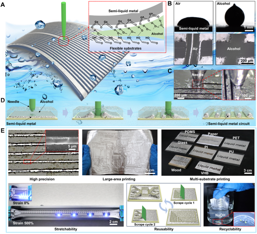 兩項(xiàng)成果均基于半液態(tài)金屬材料的研發(fā)與界面調(diào)控機(jī)制突破,分別解決了柔性電子 “高精度無(wú)損耗制造” 與 “三維曲面適配” 兩大痛點(diǎn),覆蓋從基礎(chǔ)研究、工藝開(kāi)發(fā)到器件應(yīng)用的全鏈條創(chuàng)新。