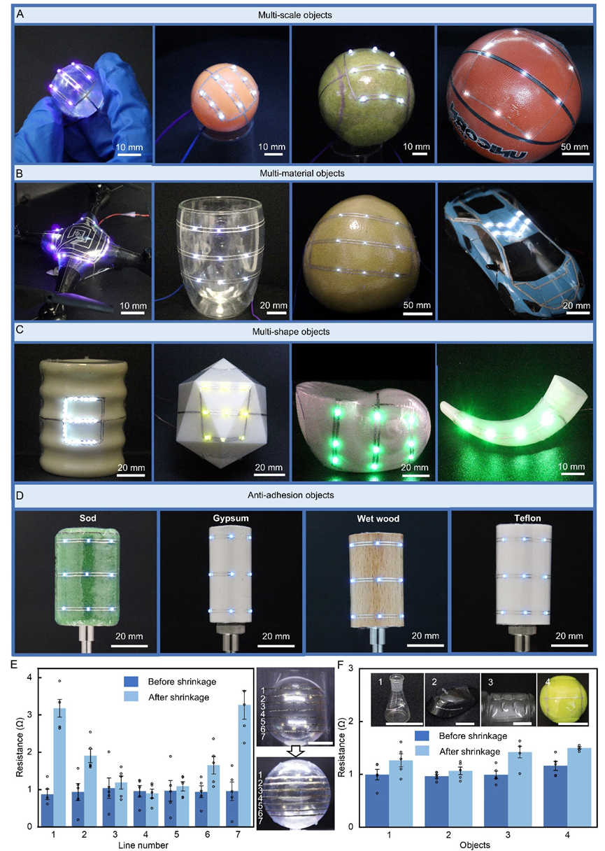 團(tuán)隊(duì)還提出了形狀自適應(yīng)共形電子制備技術(shù),攻克了三維曲面電子器件制造難題。團(tuán)隊(duì)以熱塑性薄膜為自適應(yīng)基底,通過(guò)半液態(tài)金屬Cu-EGaIn(導(dǎo)電性達(dá)9.5×106S m-1)的選擇性粘附圖案化,結(jié)合有限元仿真輔助電路設(shè)計(jì),實(shí)現(xiàn)了平面電路向任意三維曲面的高效轉(zhuǎn)化。該技術(shù)無(wú)需復(fù)雜預(yù)處理,可在球體、水果、人體皮膚等不同尺度、材質(zhì)的目標(biāo)表面穩(wěn)定貼合,剝離強(qiáng)度遠(yuǎn)超商用膠帶,成功應(yīng)用于航空航天共形除冰系統(tǒng)、智能醫(yī)療繃帶、傳統(tǒng)設(shè)備智能化升級(jí)等場(chǎng)景,為 “萬(wàn)物互聯(lián)” 時(shí)代的智能器件低成本制造提供了新范式。