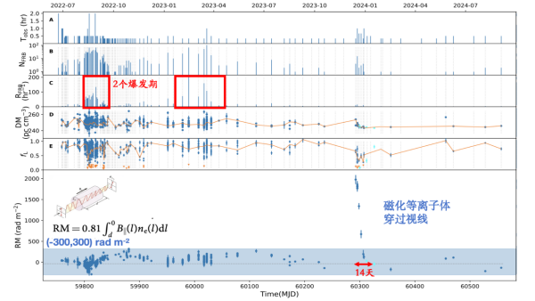 研究團隊利用FAST的超高靈敏度,對FRB 20220529開展了長達2.2年的監(jiān)測。在前一年半的常規(guī)監(jiān)測中,反映傳播路徑上自由電子密度與磁場強度的關鍵參數RM始終在-300至+300弧度/平方米的范圍內小幅波動。然而,在2023年12月,團隊觀測到該暴源的RM在短時間內急劇躍升至約2000弧度/平方米,變化幅度高達此前標準差的20倍,隨后在兩周內單調下降并恢復至常態(tài)。這種劇烈、快速且持續(xù)數周的磁環(huán)境演化現象,在國際上尚屬首次被觀測到。