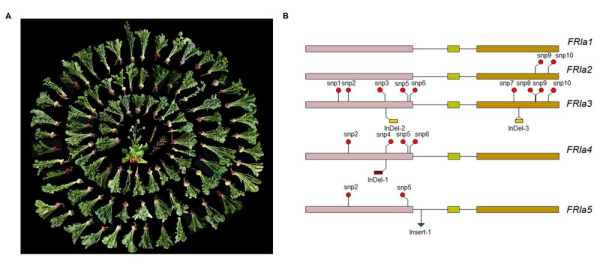 中國科學院西雙版納熱帶植物園研究人員對來自世界各地的104份地方種質資源的開花時間進行分析。來自不同地理區域的蔓菁開花時間表現出顯著差異,這與它們生長地區的海拔和氣候溫度密切相關。研究進一步分析了蔓菁FRIa和FLC2基因的遺傳變異及其對開花時間差異的貢獻。研究結果表明,開花時間關鍵調控基因FRIa變異,在蔓菁開花時間的適應性性狀上,特別是維持高海拔蔓菁晚花方面發揮著關鍵作用。同時,特異性單核苷酸多態性變異對高原FRIa基因的功能強化起作用。
