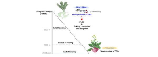 研究結果揭示了蔓菁開花時間沿海拔梯度的適應機制,為闡明FRIa如何促進蔓菁在不同海拔條件下適時開花提供了新見解,也為蔓菁FRIa強功能變異驅動海拔梯度下的開花時間適應性演化提供了分子基礎。