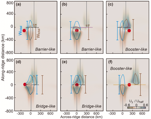 研究發現,轉換斷層對地幔柱沿脊軸擴散,可呈現三種可預測的作用模式,分別是:阻擋模式,即地幔柱位于洋脊外側或附近存在長偏移(>200km)轉換斷層時,下游脊段內地幔柱信號明顯減弱;橋梁模式,即地幔柱位于轉換斷層與洋脊交匯處時,斷層成為物質通道,可促進地幔柱物質向兩側脊段雙向擴散;增強模式,即地幔柱位于洋脊內側或斷層中心下方時,斷層的走滑運動強化沿脊地幔流,使地幔柱信號放大傳播。