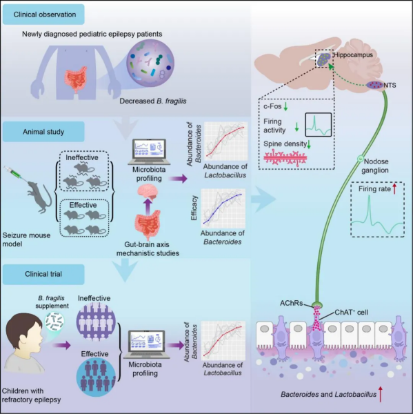 近日,中國科學院深圳先進技術研究院等,從兒童癲癇臨床菌群特征出發,揭示了一個由特定益生菌激活的全新膽堿能腸—腦神經環路,闡明了益生菌如何經迷走神經遠程調控大腦興奮性的機制。該研究在臨床研究中得到療效驗證,為難治性癲癇提供了一種安全、精準、可轉化的干預新策略。