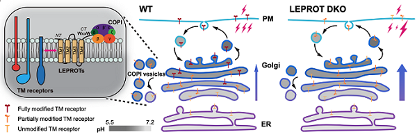 COPI介導的膜轉運,在細胞中主要負責內質網蛋白回收和高爾基體蛋白滯留。研究發現,LEPROTs主要定位于順式與中間高爾基體區域,其缺失會導致高爾基體形態異常。同時,LEPROTs可與COPI衣被蛋白及多類跨膜區較長的整合膜蛋白結合,在酸性環境下將跨膜受體捕捉,并由COPI系統將其短暫“滯留”于高爾基體,使其獲得充分的糖基化、脂酰化等關鍵修飾。在LEPROTs缺失的細胞里,跨膜受體被提前釋放至下游通路,使EGFR、TFRC等多種信號受體發生加工缺陷和活性異常。