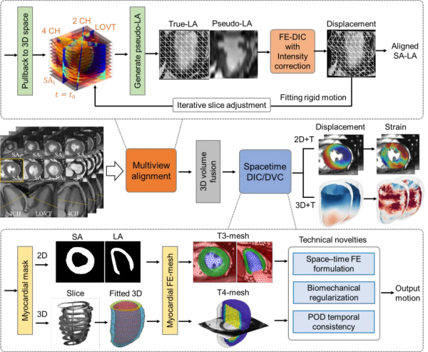 該框架以有限元形函數表征心肌位移場,通過全局相關優化保證空間連續性并引入符合生理特性的力學約束以抑制噪聲放大和非物理形變;同時結合基于奇異值分解的數據驅動時空模態分解策略,確保時間連續性,并顯著降低計算復雜度,實現了從常規Cine MRI到心肌運動場與應變場的統一求解。