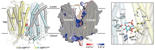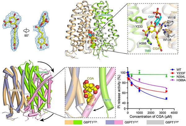 肝臟葡萄糖輸出在維持機體血糖穩態的精密調節網絡中具有重要作用。葡萄糖-6-磷酸(G6P)作為糖原分解與糖異生途徑的共同終末產物,其向內質網腔的跨膜轉運,是肝臟釋放葡萄糖至血液循環的限速步驟。介導這一關鍵轉運任務的功能蛋白,為內質網膜上的葡萄糖-6-磷酸轉運蛋白1(G6PT1)。G6PT1的功能完整性至關重要:其功能喪失會引發嚴重的常染色體隱性遺傳代謝病——Ib型糖原貯積癥,患者臨床表現為危及生命的低血糖、肝腫大及中性粒細胞功能障礙;與之相對,在2型糖尿病中,適度且可逆地抑制G6PT1活性,可有效降低肝臟過度的葡萄糖輸出,因而成為調控血糖的潛在有效治療策略。研究證實,天然化合物綠原酸(CGA)可抑制G6PT1,且在臨床實驗中被證實能有效降低2型糖尿病患者的血糖水平,因此被視為前景廣闊的潛在抗糖尿病藥物。盡管G6PT1生理與病理意義重大,但學界對其底物識別機制、磷酸耦合驅動G6P轉運的分子路徑、蛋白構象的動態變化規律,以及CGA實現特異性抑制的作用機制等問題尚不明晰。