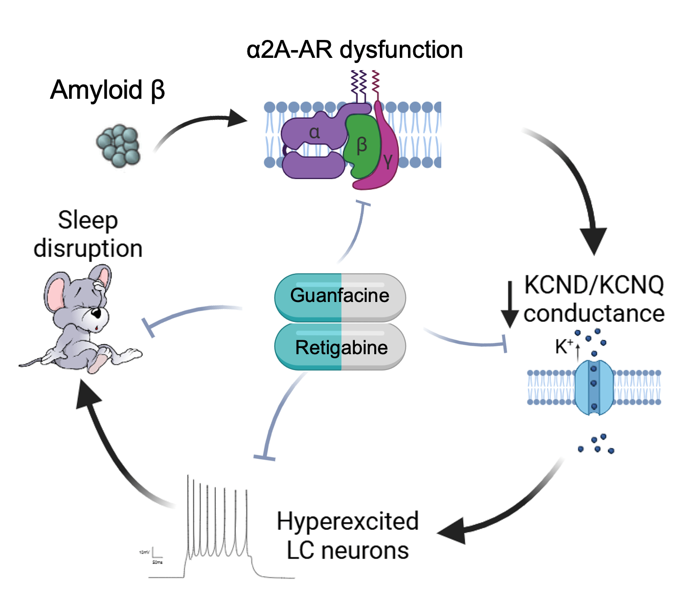 研究團隊通過5xFAD轉基因阿爾茨海默病小鼠模型,結合睡眠監測、全細胞膜片鉗、藥理學調控等多種技術手段發現,2月齡階段的5xFAD小鼠已出現暗周期特異性覺醒過度及腦狀態轉換能力下降的病理表型。在機制層面,研究團隊觀察到藍斑神經元存在暗周期時相特異性自發放電頻率升高的現象,其底層機制表現為:Aβ寡聚體干擾了維持藍斑神經元正常活動水平的α2A型去甲腎上腺素受體功能,使其對兩種具有神經元活性“剎車”效應的電壓門控鉀離子通道4(Kv4)與電壓門控鉀離子通道7(Kv7)的調節功能失靈,進而造成藍斑神經元興奮性在暗周期出現異常升高。