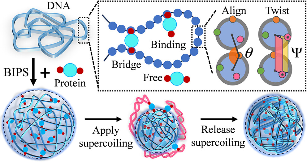 在生物大分子體系中,電荷作用、氫鍵、疏水作用、π–π與陽離子—π等非共價相互作用,決定蛋白與核酸如何識別、組裝并形成生物分子凝聚體。對染色質相關凝聚體而言,這些“相互作用網(wǎng)絡”之外,還存在一個關鍵自由度——DNA在轉錄與拓撲異構酶調控下不斷積累/釋放扭轉載荷,形成DNA超螺旋。超螺旋不僅可能改變蛋白—DNA的結合幾何與多價橋聯(lián)方式,更可能直接重塑凝聚體的內(nèi)部結構與尺寸演化路徑。