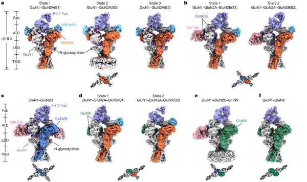 該研究揭示了內源性NMDA受體的構象多樣性和門控機制,強調了GluN2A在突觸信號傳導中的核心作用,為學界理解大腦中亞型特異性受體的功能差異建立了結構框架,也為后續研發靶向特定NMDA受體亞型的神經疾病治療藥物奠定了結構基礎。