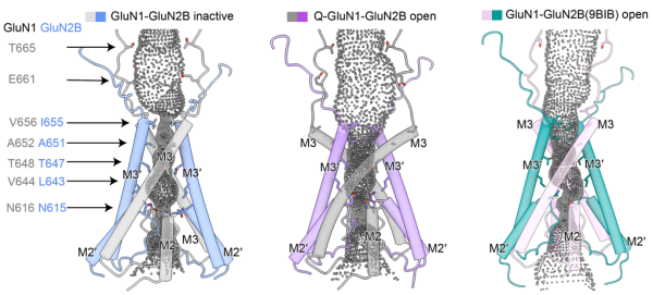 研究團隊還在內源性GluN1-GluN2B受體中捕獲到一個此前從未觀察到的完全開放構象。該結構顯示,受體通道門控M3 helix在GluN1和GluN2B兩個亞基中均發生明顯的向外旋轉,導致離子通道孔徑顯著擴大,從而實現真正意義上的通道開放。