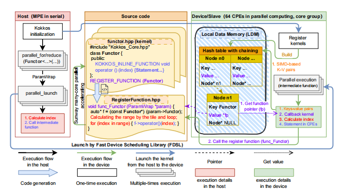 針對神威處理器獨特的硬件約束,研究團隊通過引入并行執行抽象,實現了源代碼到二進制級別的性能可移植,降低了超算應用的開發與遷移成本。科研人員在swKokkos中引入了向量化哈希索引與FDSL快速調度庫,降低內核啟動開銷;同時,提出分塊并行映射算法,進一步提升負載均衡與緩存利用率。swKokkos在AXPY、數值求解器等任務中性能達原生Athread的99%以上,還能支撐海洋模型LICOM超10萬核規模的穩定模擬并實現加速。