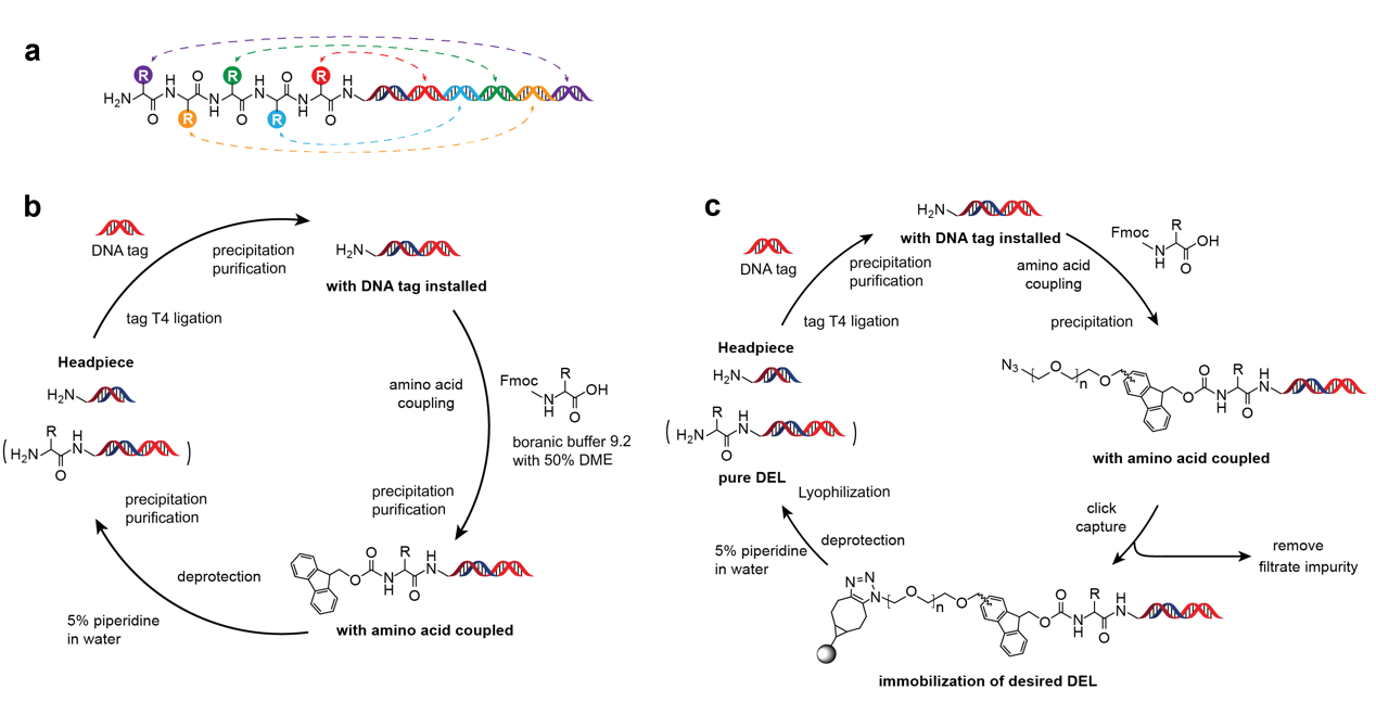 ????近年來,多肽類藥物的有效性與安全性優勢日益凸顯,多種創新療法已獲批用于臨床治療。DNA編碼多肽文庫(PDEL)憑借高通量、操作簡便、樣品需求量低、篩選成本可控及流程高效等特點,在非天然多肽分子研究領域展現出獨特優勢,其通過化學合成,實現了多肽序列與DNA標簽的共價偶聯,突破了傳統多肽展示技術的化學兼容性局限,并可靈活引入非天然氨基酸,拓展了多肽藥物的設計與優化空間。然而,現有PDEL缺乏有效純化手段,在文庫長度、整體純度及序列均一性方面存在明顯不足。隨著多肽長度增加,Fmoc氨基酸與DNA偶聯過程中的未反應原料及副產物逐步累積,截短肽與非目標序列比例升高且逐步占據主導,導致PDEL整體質量隨長度增加而明顯下降。這種質量劣化不僅降低篩選效率,還易引入大量假陽性、假陰性結果,干擾真實高親和力配體的識別,進而增加高質量多肽分子的發現難度。