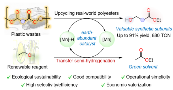 近日,中國科學院寧波材料技術與工程研究所團隊,提出了以豐產金屬錳為催化劑、乙醇既作為氫源又作為酯交換試劑的新策略,將包括PET在內的多種聚酯廢棄物,選擇性地轉化為含有羥甲基和酯基雙官能團的高附加值化學品。