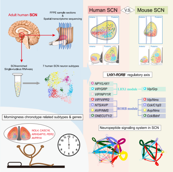 近日,中國科學院腦科學與智能技術卓越創新中心團隊等,在單細胞水平上重構了人類視交叉上核(SCN)——調控晝夜節律行為的核心腦區的細胞構筑與空間轉錄組圖譜,并解析了人類SCN的神經元亞型。該研究通過對圖譜的深度挖掘,揭示了人類SCN特有的神經肽信號通路和跨物種保守的基因調控程序,并發現了與人群中時型差異相關的潛在神經機制。