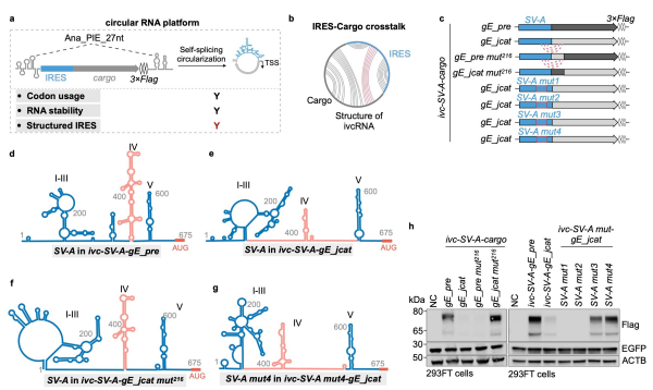 研究基于高效的自剪接成環系統,構建了不同病毒來源IRES以及相同熒光素酶報告基因的ivcRNAs。研究同時利用相關技術,在活細胞中直接解析長鏈環形RNA的二級結構。為驗證IRES與cargo之間不利的相互作用會損害IRES結構并抑制翻譯,研究設計了定點突變實驗,在cargo區或IRES結構域IV引入點突變,以構建不同突變類型的ivcRNAs。分析顯示,這些突變阻斷了IRES與cargo間的堿基配對,恢復了SV-A結構域IV的十字形構象。基于此,研究通過定量指標,量化SV-A結構變化。修復SV-A結構后,gE蛋白表達完全或部分恢復,且表達水平與IRES結構域IV的結構完整性呈強正相關。