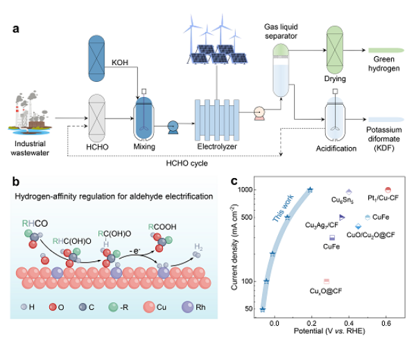 研究提出耦合陽極甲醛氧化的電解水制氫新策略,實現綠氫與高附加值化學品聯產。研究構筑了Rh1Cu單原子合金催化劑。該催化劑在甲醛電氧化生成甲酸與氫氣反應中表現出高的法拉第效率,并且具有超低過電位和超高電流密度,性能顯著優于當前所報道的催化材料。構建的耦合電解系統實現雙極產氫與高附加值化學品二甲酸鉀的聯產,展現出良好的工業應用潛力。