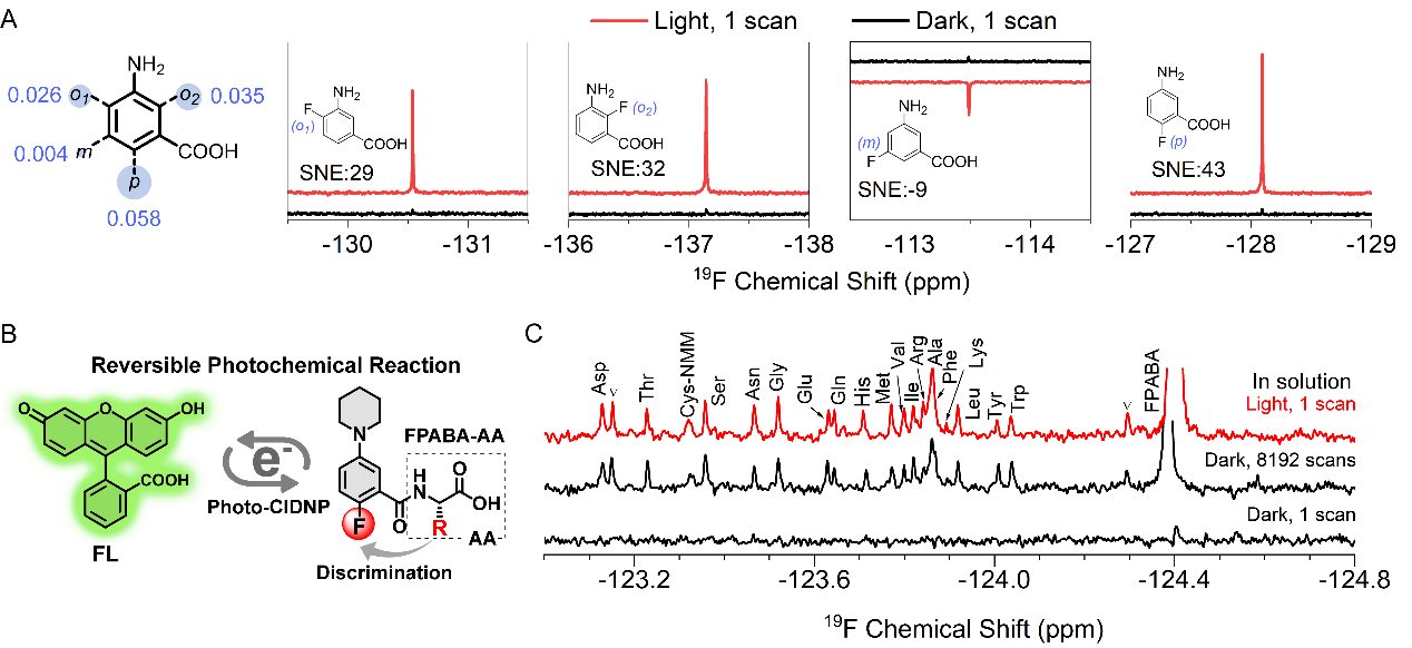 (A)自由基在不同位置處19F的自旋密度及極化性能;(B)19F NMR識別及信號增強機制;(C)1 μM氨基酸混合物的19F NMR譜