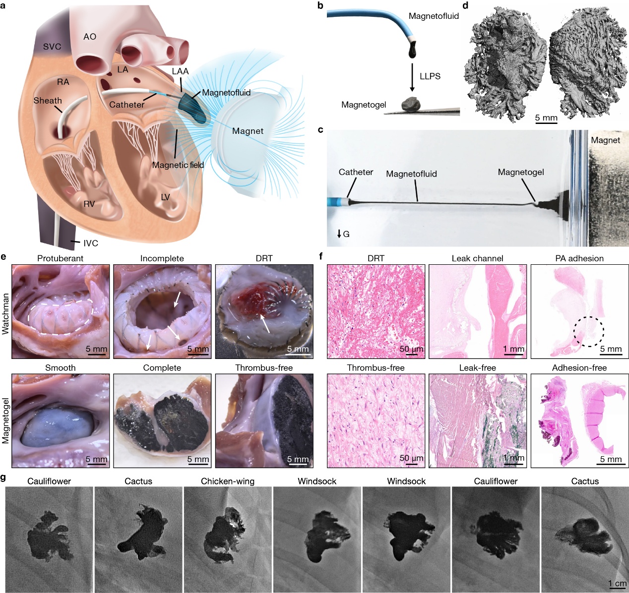 新型磁流體機器人可經心臟介入導管進入左心耳,在磁力牽引下,能成功對抗高速血流和劇烈心跳帶來的干擾。與血液接觸后,它能快速原位固化,繼而形成完全貼合左心耳形狀的磁凝膠,對出血部位完全封堵。