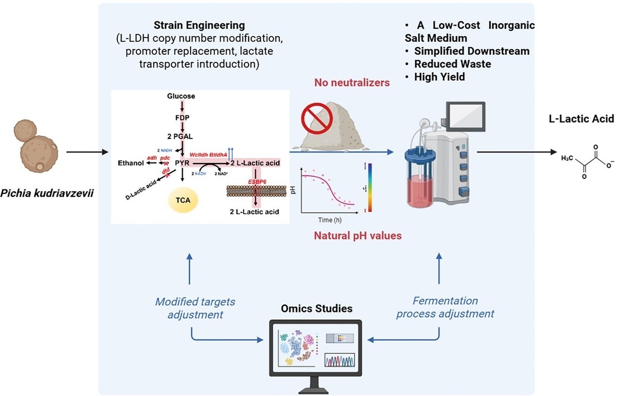 傳統(tǒng)有機(jī)酸發(fā)酵工藝需添加中和劑,來(lái)維持接近中性pH的生產(chǎn)環(huán)境,但這會(huì)導(dǎo)致后續(xù)純化提取過(guò)程中產(chǎn)生大量石膏廢渣。此前,為實(shí)現(xiàn)有機(jī)酸清潔生產(chǎn),中國(guó)科學(xué)院微生物研究所研究團(tuán)隊(duì)從白酒釀造資源中,篩選獲得了具有高魯棒性的庫(kù)德里阿茲威氏畢赤酵母。該菌株可在初始葡萄糖濃度>200g/L、pH<3.0的培養(yǎng)環(huán)境下快速生長(zhǎng),是實(shí)現(xiàn)有機(jī)酸發(fā)酵的理想底盤(pán)細(xì)胞。研究團(tuán)隊(duì)通過(guò)代謝工程改造,研究出無(wú)需中和劑的L-乳酸發(fā)酵工藝,并系統(tǒng)闡述了非常規(guī)酵母在有機(jī)酸生物制造領(lǐng)域的應(yīng)用潛力與發(fā)展前景。